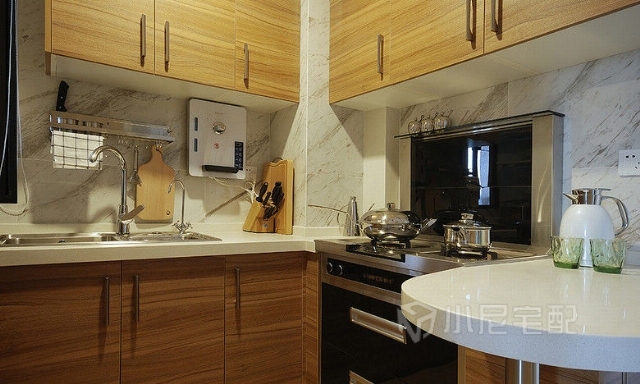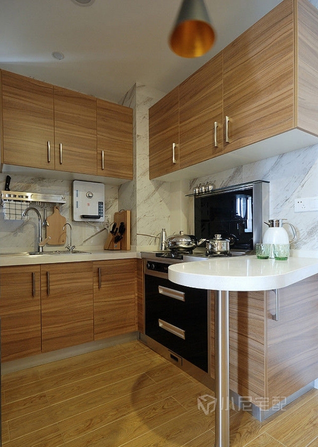 開(kāi)放式小廚房,原木紋理在昏黃的燈光的照射下,覺(jué)得暖暖的。