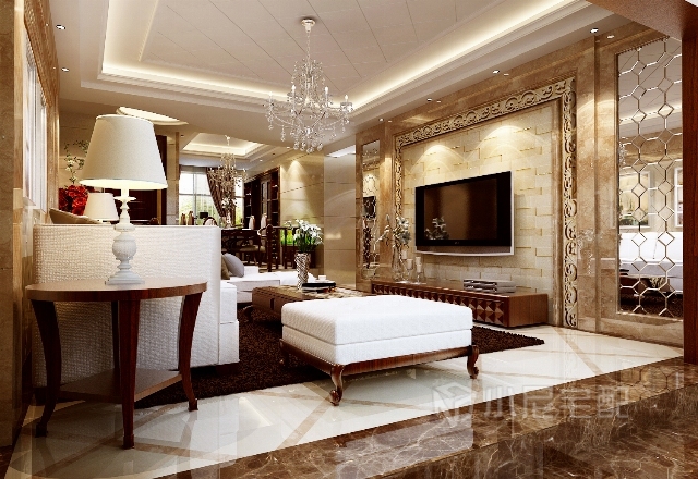 沙發背景石材上墻以呼應電視背景的效果,呈現整體感。