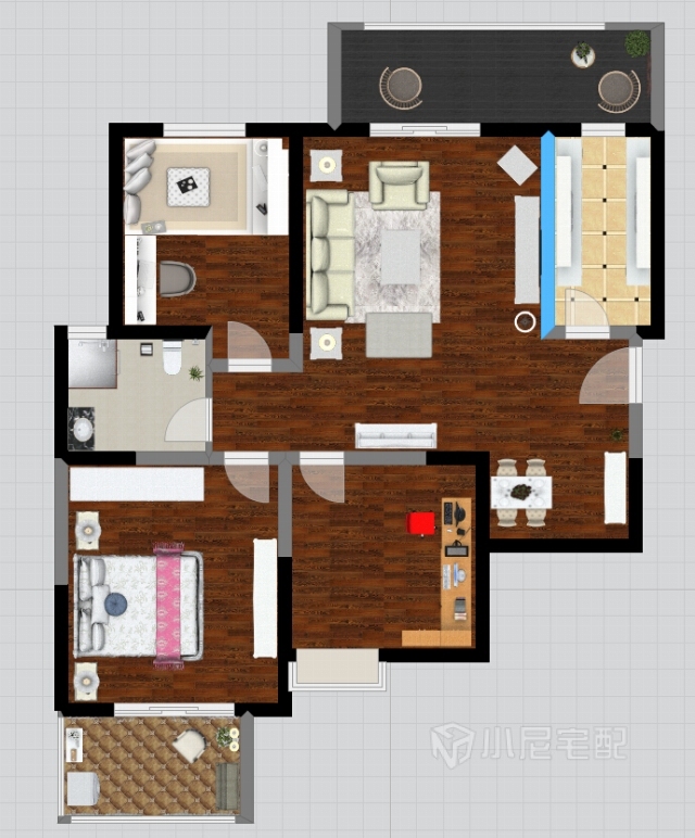 陽臺設計與客廳相互照應,綠色盆栽增添生機。