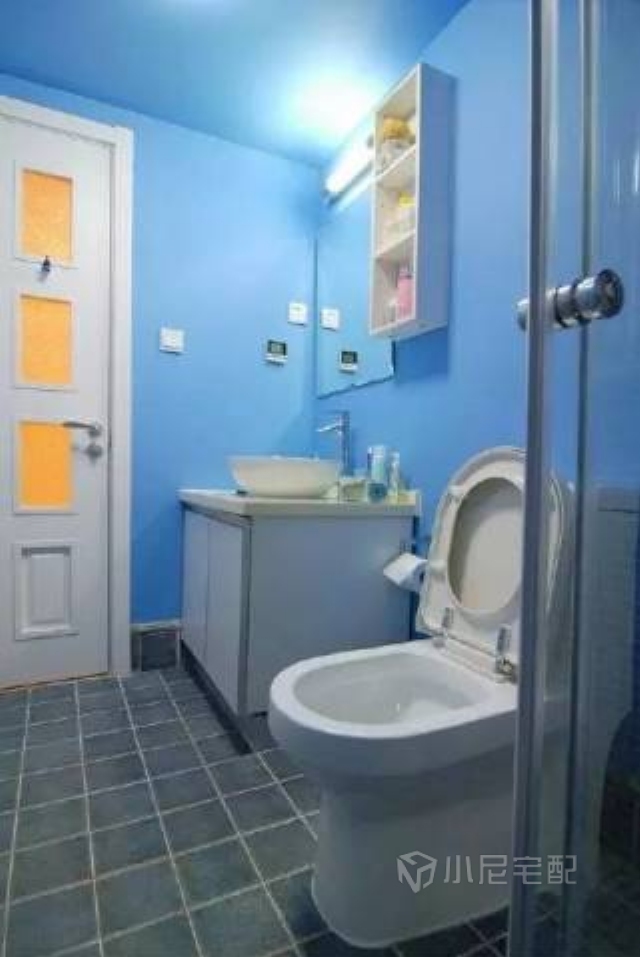 衛生間的墻壁是藍色的,顯得干凈整潔一些,洗手池上方還有一個放置洗漱用品的小架子,物品的拿取非常方便奧。