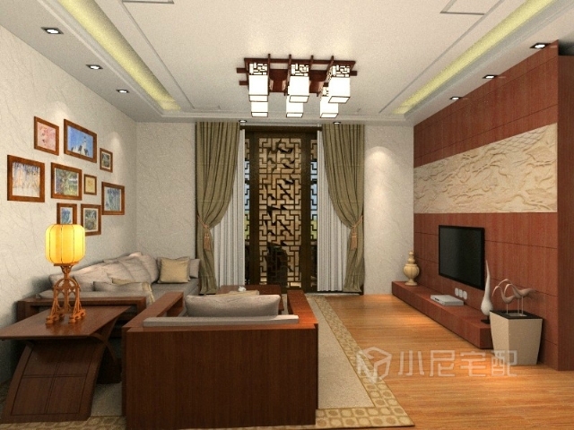 電視墻與電視柜的格調與中式家具相搭配,營造和諧景象。