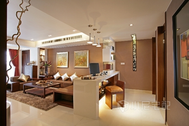白色和米色的環境中,加了一些棕色來一起營造出溫馨的客廳。