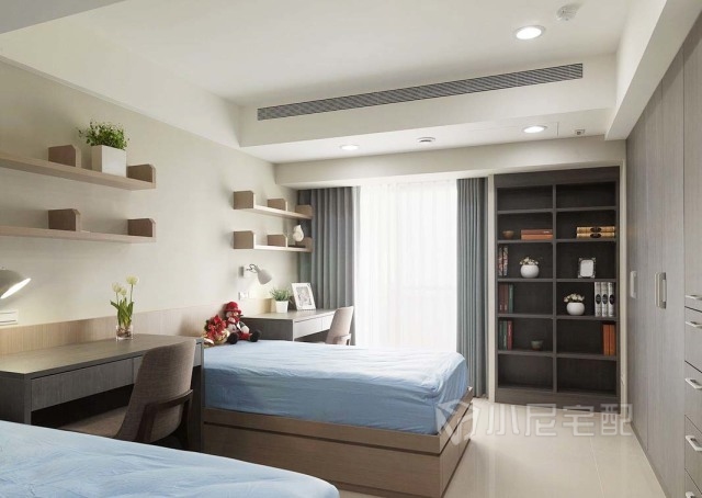 兩個男孩的房間,床頭都整合了各自的閱讀區,床尾的衣柜后面是老人房,既可以收納又可以隔開兩個空間。