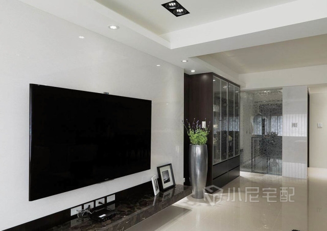 地板采用深色石材,墻面與天花構成一字線條,端景墻是用琉璃和石材鋪成的。