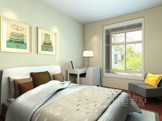 書桌、書椅加上休閑椅,使這個臥室多功能化,是一個休閑娛樂工作的好地方。