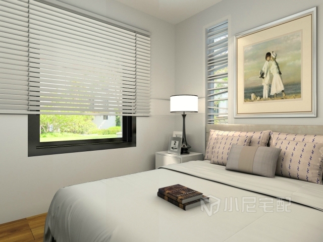 白色的卷簾,搭配白的雙人床,使臥房更加潔凈,且富有現代感。