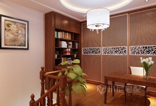 書(shū)房在樓上的位置開(kāi)放式的儲(chǔ)物位置,以木色書(shū)衣柜推拉門非常協(xié)調(diào)