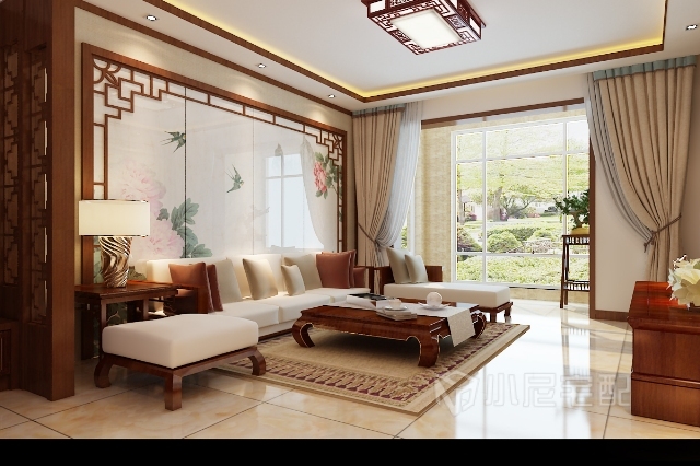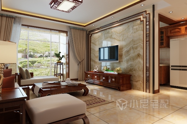 沙發(fā)背景墻用同木色的中式花格卸料了中式韻味
