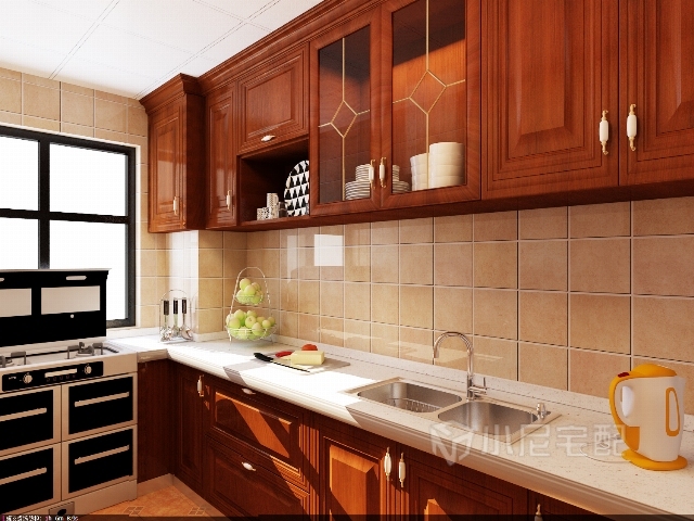 展現(xiàn)的是一個(gè)廚房的大角度,吊柜做了半開(kāi)放式搭了兩扇玻璃門起到畫(huà)龍點(diǎn)睛的作用是整個(gè)廚房更加有風(fēng)格。