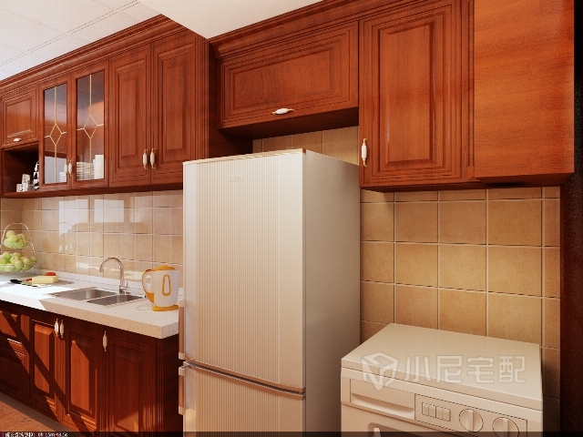 此圖突出吊柜的轉(zhuǎn)角柜的處理,里邊有橫梁和管道,也巧妙的隱藏起來(lái),各位可效仿。