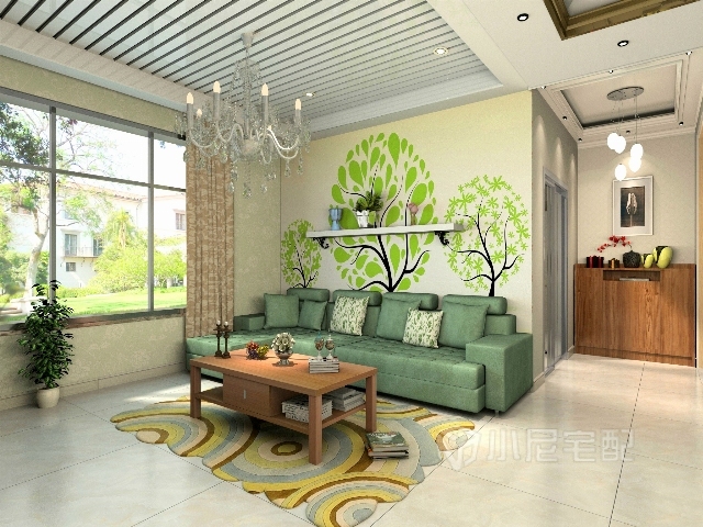 電視背景墻的一抹綠色墻紙給整個不大的空間帶來了生機。