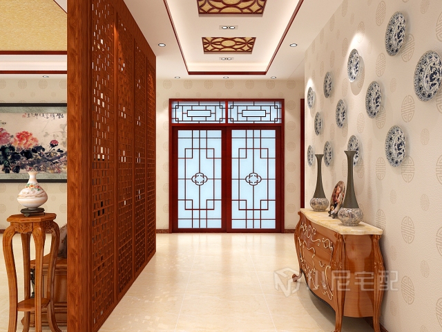 走道造型墻青花瓷盤的裝飾體現中式的厚重感覺