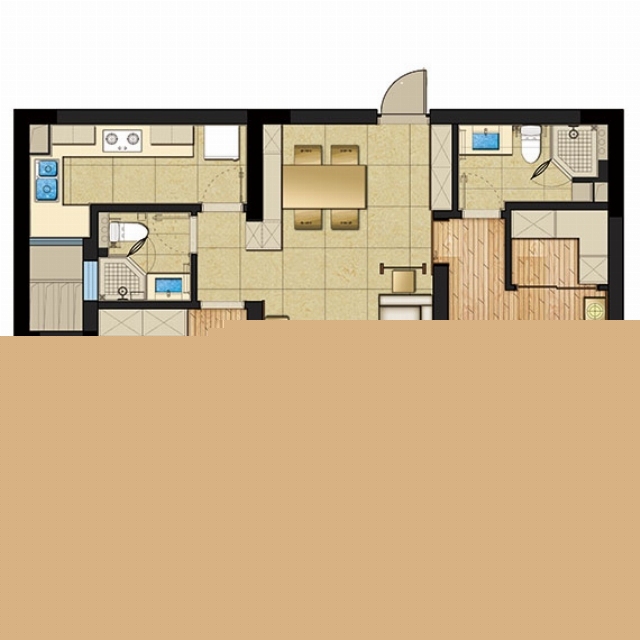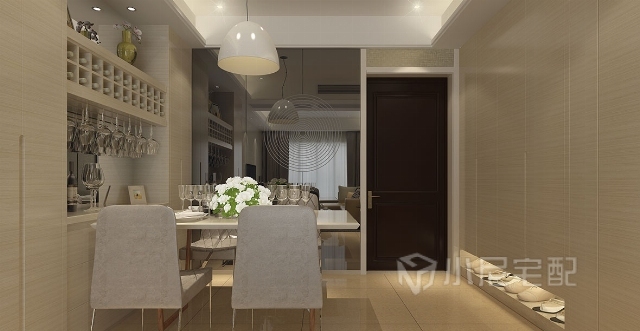 客廳-沙發(fā)、茶幾、電視柜一體色,加與壁紙,木飾面強烈的對比色,具有更出眾的視覺效果。