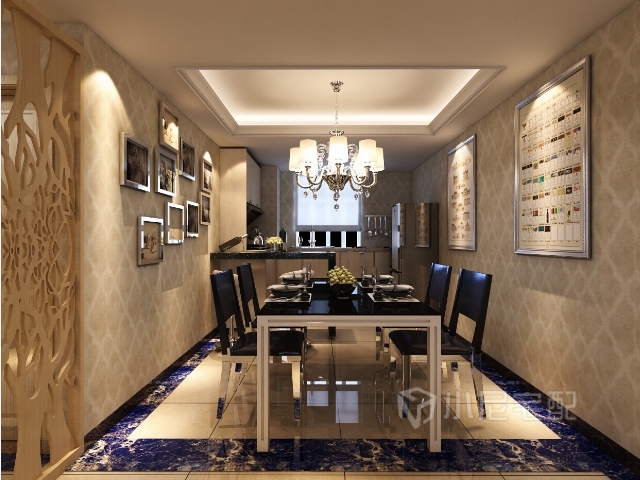 運用照片墻、水晶燈飾、石材的裝備,框塑出餐敘區域低沉而奢華的空間意象。