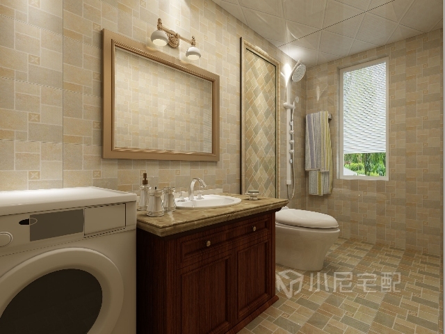 整體的瓷磚上下呼應,回型背景與邦度衛浴的花邊鏡框深色橡木洗手臺,無一不體現著中式韻味。