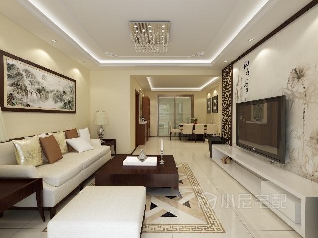木質茶幾和沙發與電視墻相互呼應,背靠大幅山水畫,凸顯主人胸懷廣闊底蘊非凡,地面的造型拼花更是畫龍點睛,一幅完美的圖畫呈現在您眼前。