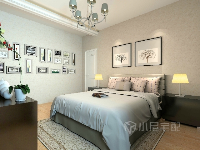 米黃色背景墻上用幾幅掛畫來裝飾,給臥室一個溫暖的氛圍。