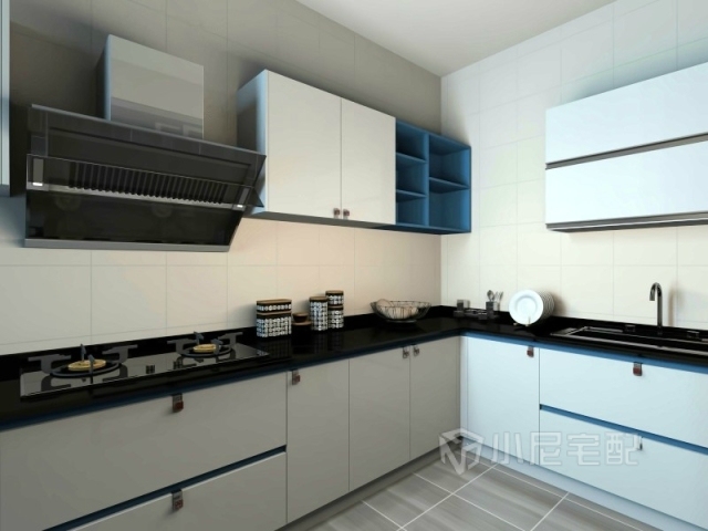 黑色的抽油煙機,搭配黑色的灶臺,臺面,一體感一涌而出。配上白色的柜體,時尚感十足。