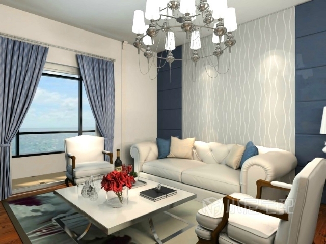 大窗讓客廳格外亮堂,藍色與白色的搭配令人心曠神怡。