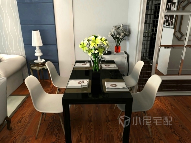 玻璃餐桌搭配木質的支架,極具特色。