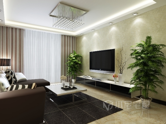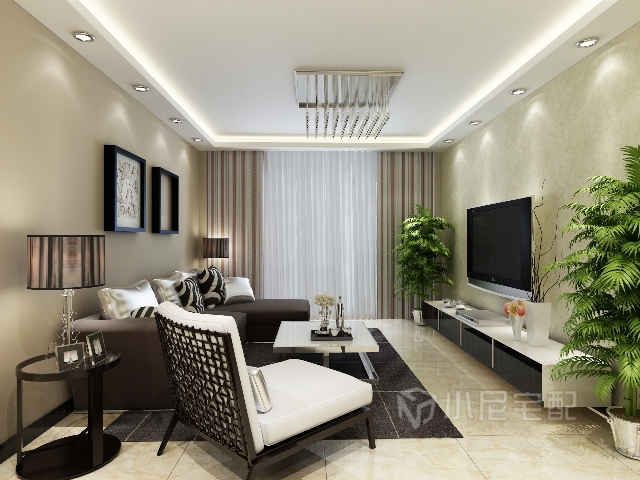 簡單的吊頂與飾面,使客廳看起來并不繁瑣,深淺搭配使整個空間看起來干凈整潔。配上綠植的明亮色彩,讓客廳少了一絲刻板,多了一份靈動。
