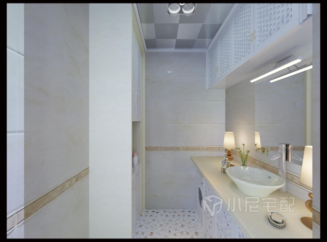 衛生間采用兩色拼接鋁扣板設計,梳洗臺整體設計,連同洗衣機裝于臺下,使用空間大大提升