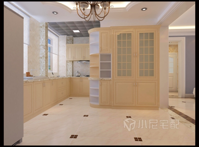 廚房整體定制,獨特的弧形擺臺設計結合酒柜設計讓使用空間大大提升
