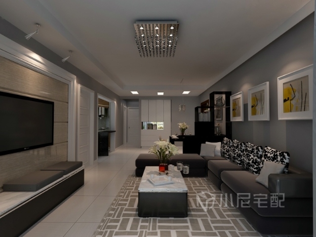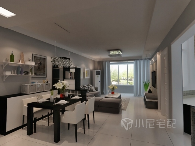 客廳鋪設(shè)淺色地磚,選用深色家具穩(wěn)定空間。