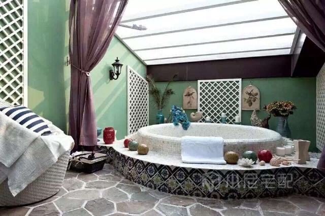 浴室是露天設計,圓形的浴池美觀特別,洗浴時抬頭望見天空,就如暢游在大海里。