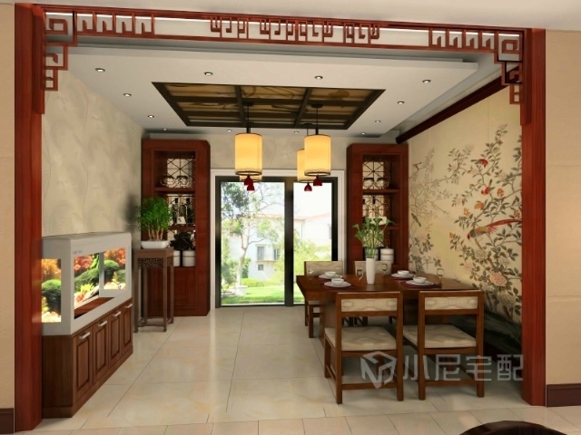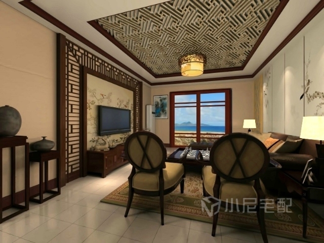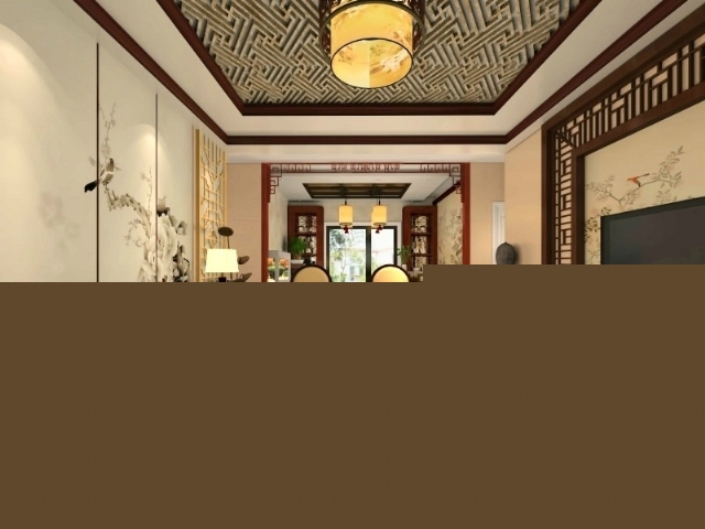 電視背景墻和吊頂都采用了中式花格,散發(fā)著濃郁的中式風(fēng)。