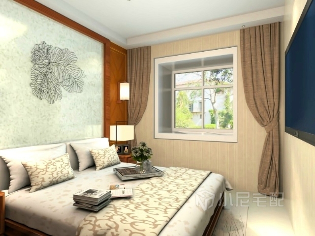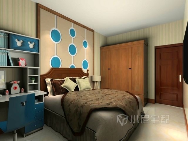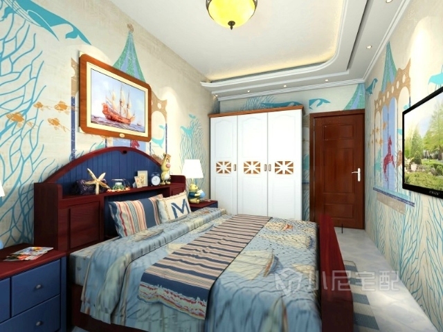 小兒子房間,藍(lán)色窗簾與藍(lán)色床頭和墻紙想呼應(yīng)。