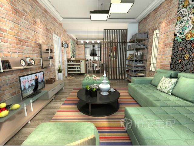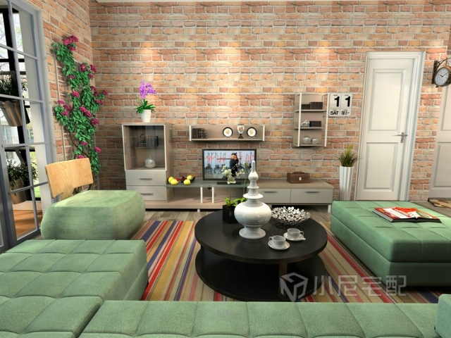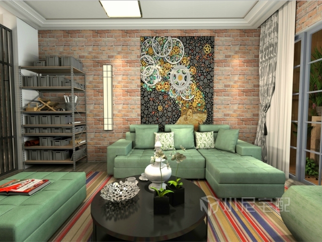 客廳墻面的板磚充滿氣氛感,布藝沙發和實木電視柜構成了復古風格的最佳搭配