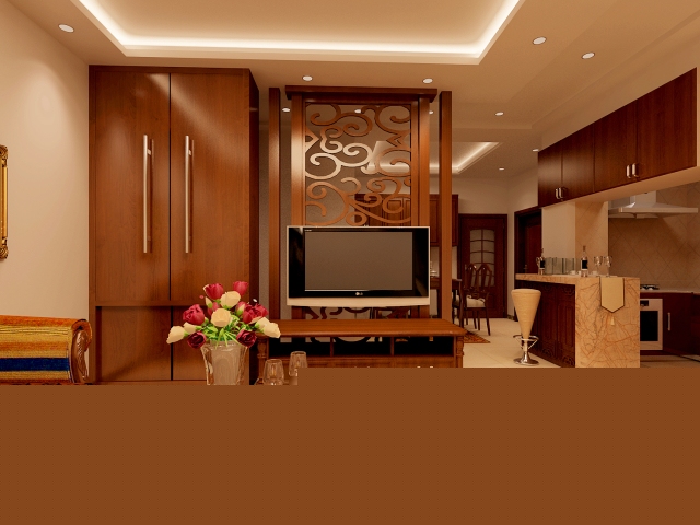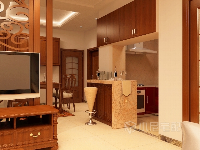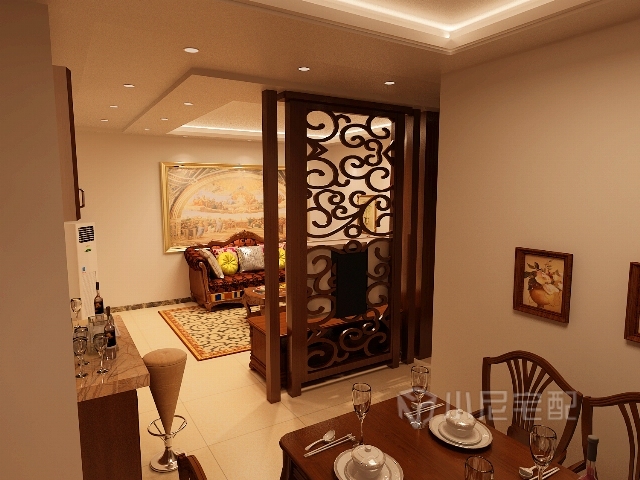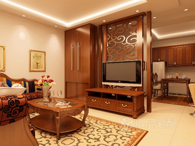 客廳電視墻,因為布局原因另加隔斷花格,增加空間分配
