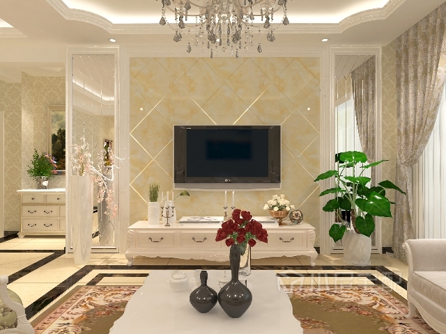 電視背景墻以暖色墻磚和白調鏡面搭配,給人以舒適溫馨之感