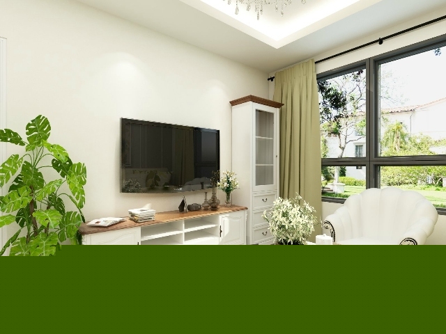 白色田園風格的電視柜組合,綠色的植物增加整個空間的活力。