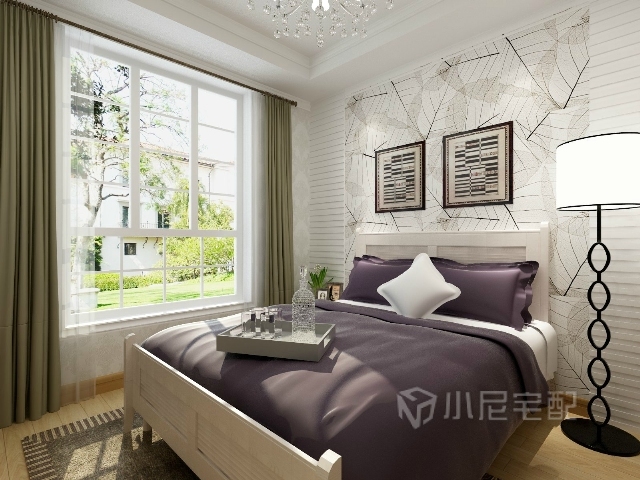 床頭墻選用葉子圖案的裝飾墻搭配草綠色的窗簾,增加自然的清爽的情調。