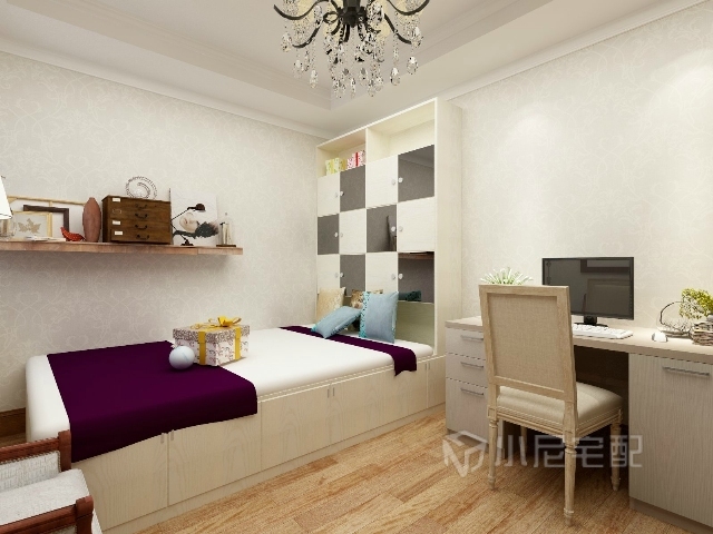 淡藍色的背景墻,顯得恬靜安逸,乳白色的窗簾,窗前的沙發凳,使整個臥室更加舒適柔美。