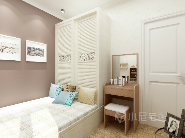 淡褐色的墻紙搭配現代裝飾畫,定制榻榻米加衣柜使整個房間一下就多出幾平米的利用空間。