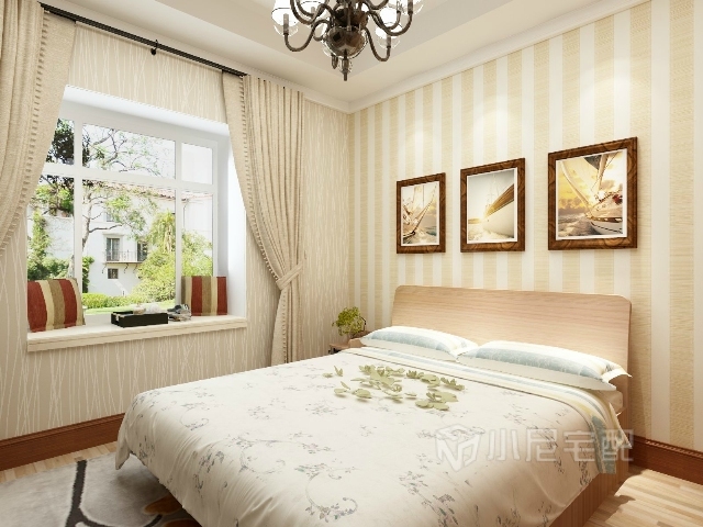 暖色的壁紙搭配棕色裝飾畫,一扇飄窗配上兩個抱枕,顯得悠閑舒適。