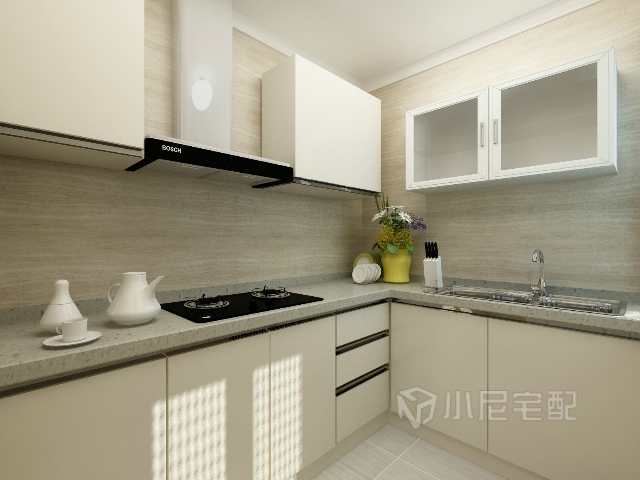 簡約的淺色櫥柜,棕褐色條紋墻磚,顯得既時尚又簡約。