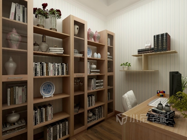 一整面的大書柜,淡色條紋壁紙,打造一個安靜的工作空間。