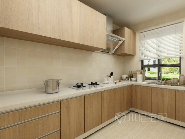 廚房選用原木的櫥柜組合,白色的石英石臺面,簡約時尚。