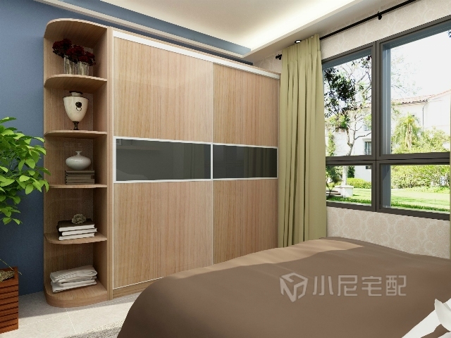 大大的推拉門衣柜為臥室增加了極大的儲物空間,用綠植點綴,顯得生機勃勃。
