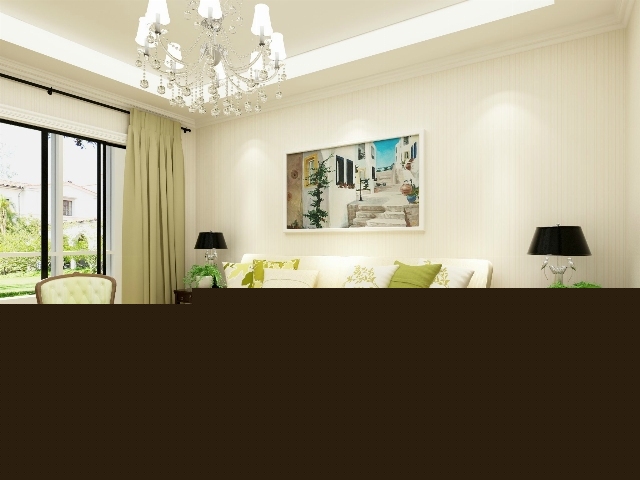 綠色的沙發抱枕和窗簾相呼應,白色的布藝沙發黑色的邊幾,舒適又時尚。