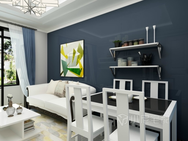 寶藍(lán)色的墻面,現(xiàn)代感十足。客廳餐廳融為一體,節(jié)約小戶型空間。