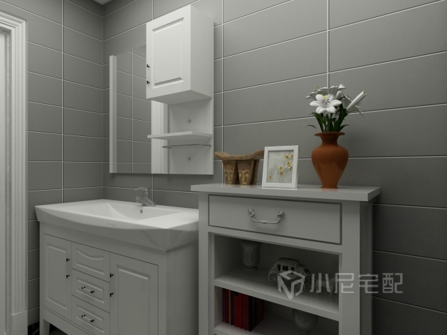 灰色的墻磚,白色的浴室柜與邊柜,美觀又實(shí)用