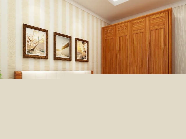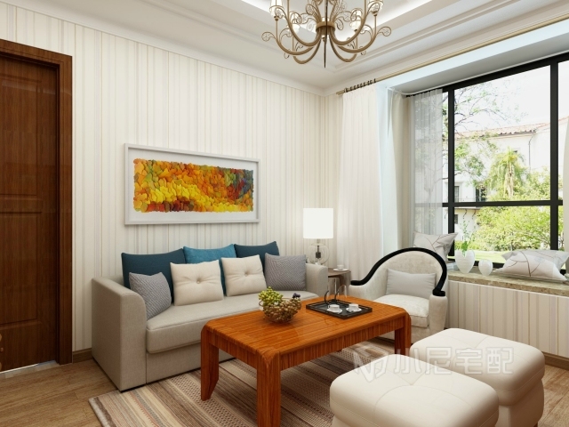 潔白的窗簾,條紋壁紙,搭配色彩較亮的家具,冷暖結(jié)合,溫馨舒適。