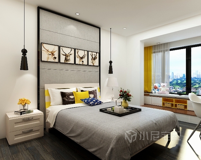 飄窗柜的設計不僅增加儲物空間,搭配上軟墊又可以坐在上面看書看風景。用布質的柔感,使整個空間營造溫暖舒適的氛圍。