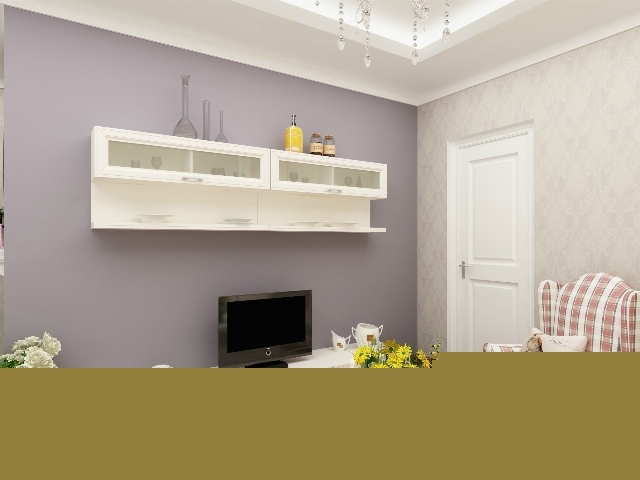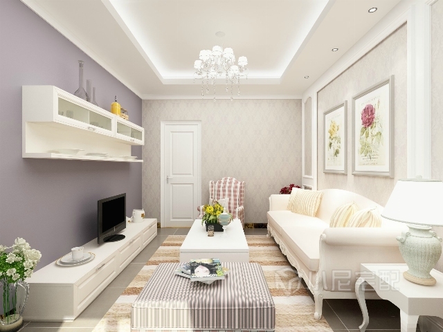 電視背景墻用顏色深一點的紫色涂料,襯托著白色的家具,簡潔大方。