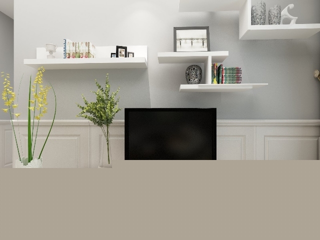 電視背景也沒多做修飾,放置幾個擱板增加儲物功能即可